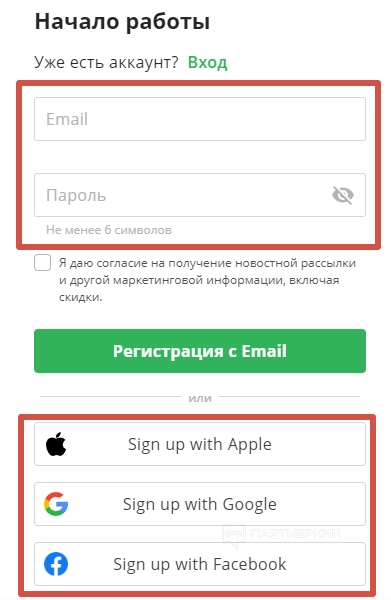 Далее системы предложит пройти регистрацию. Для того указываем электронную почту и пароль, или проходим авторизацию, используя аккаунты Google, Facebook* или Apple.