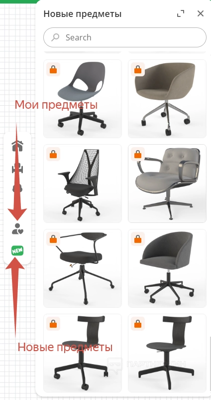 Следующий раздел в панели инструментов – «Мои предметы». Здесь будут отображаться файлы и изображения, которые пользователь загрузил со стороны. Последний раздел – «Новые предметы». Здесь отображаются 3D-модели мебели и объектов, которые были добавлены в библиотеку сервиса в рамках последнего обновления.