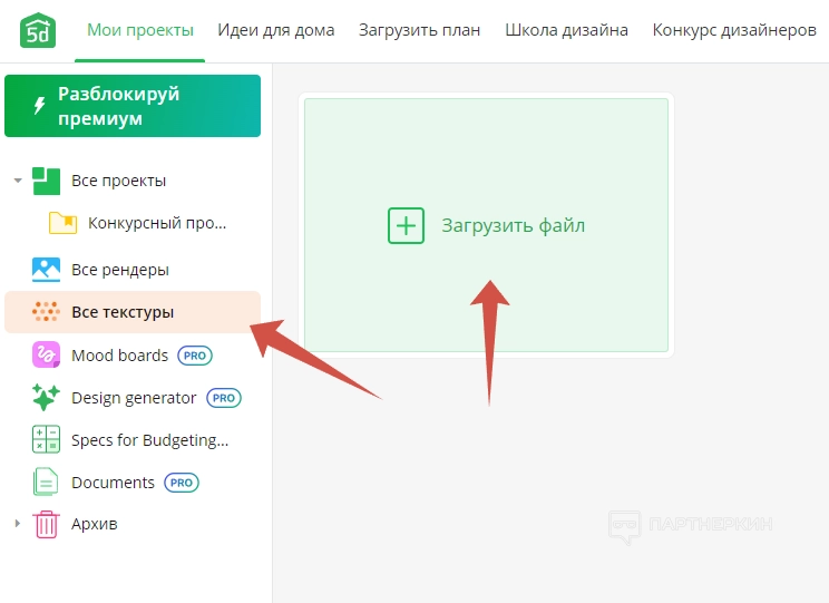- Панель проектов – предоставляет доступ к проектам, рендерам, загруженным текстурам и разным документам.
