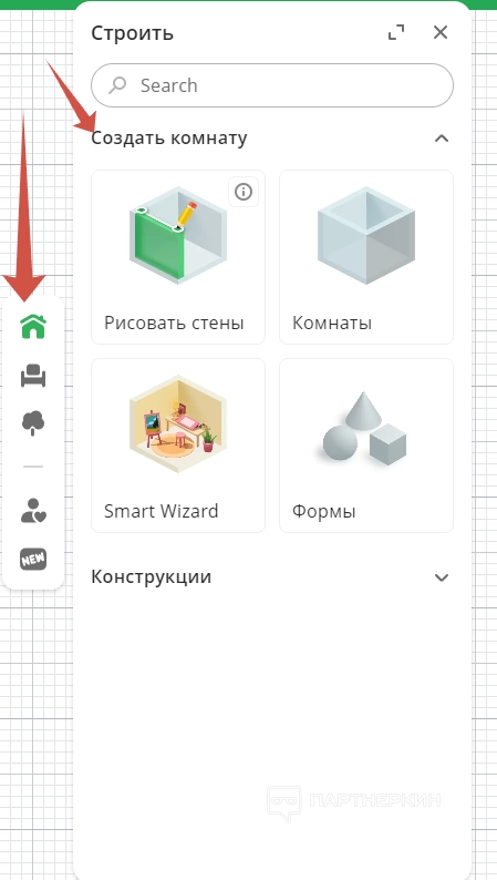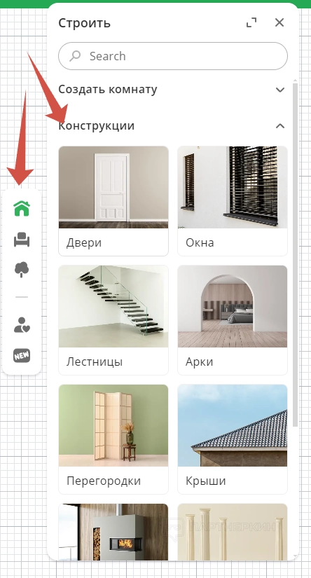 Рассмотрим более подробно панель инструментов. Первый раздел – «Строить». Кликнув на него, пользователь развернет меню, где будет 2 вкладки: «Создать комнату» и «Конструкции».