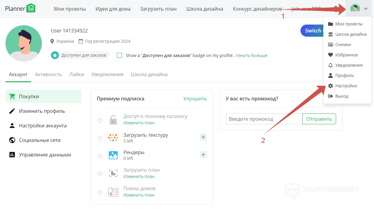 - Покупки – отображает тарифный план, включая лимиты по текстурам и рендерам. Также здесь можно ввести промокод.
