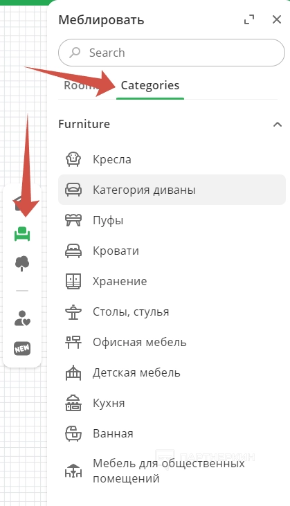 Следующая вкладка – «Категории». Здесь мебель тоже имеет разделение, но по другому формату: