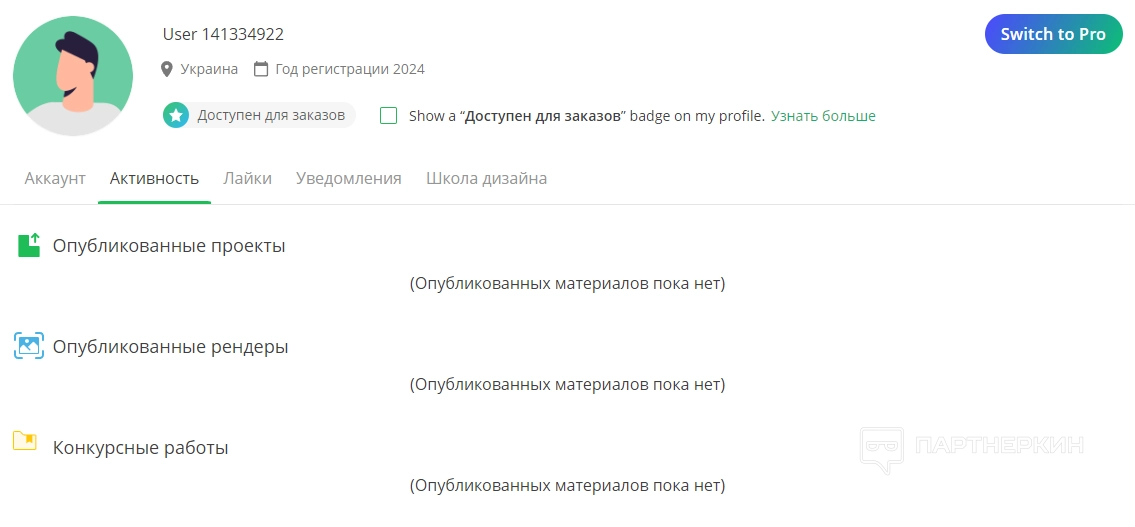 Следующий раздел – «Активность». Отображает количество опубликованных проектов, рендеров и конкурсных работ.