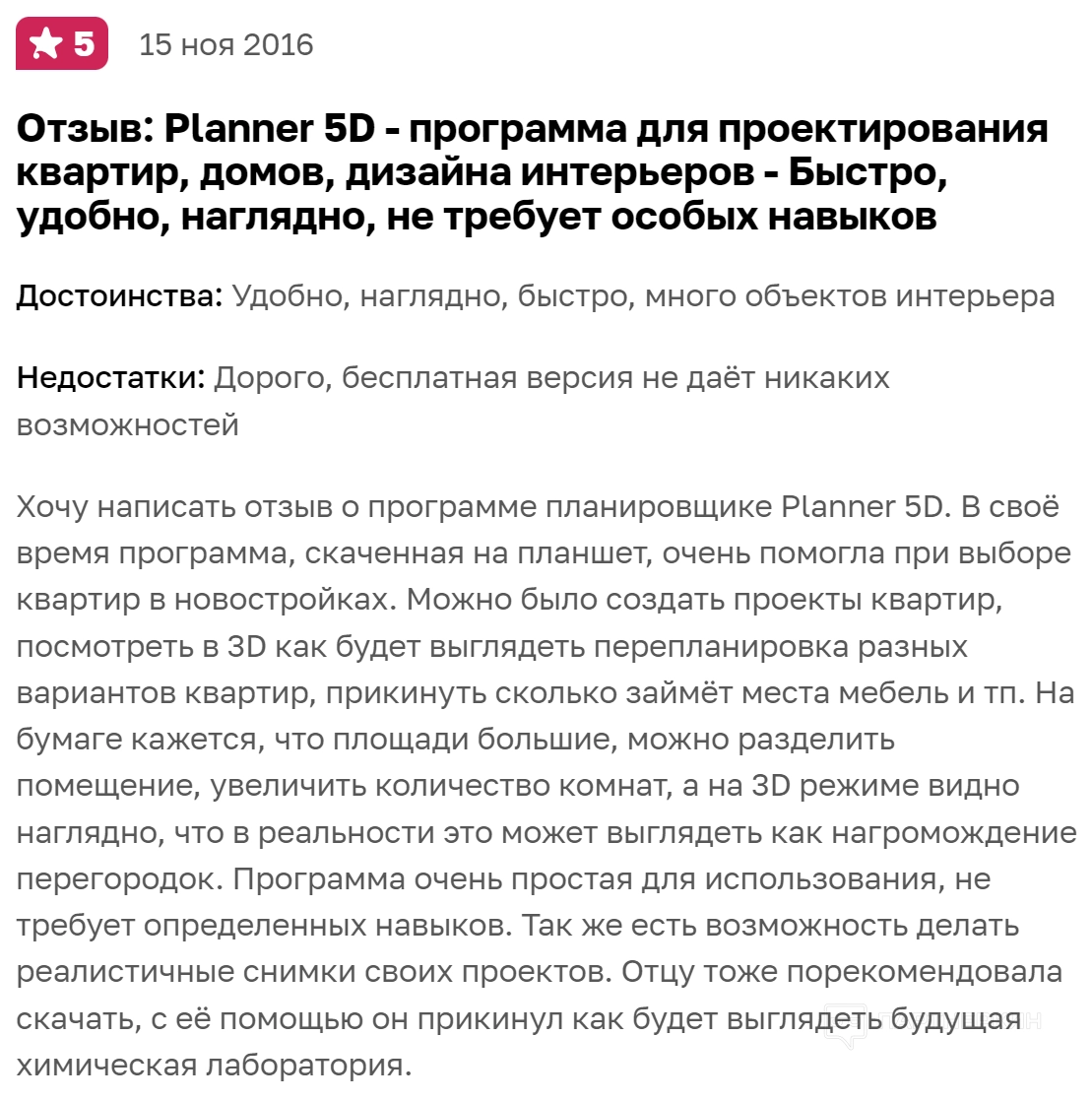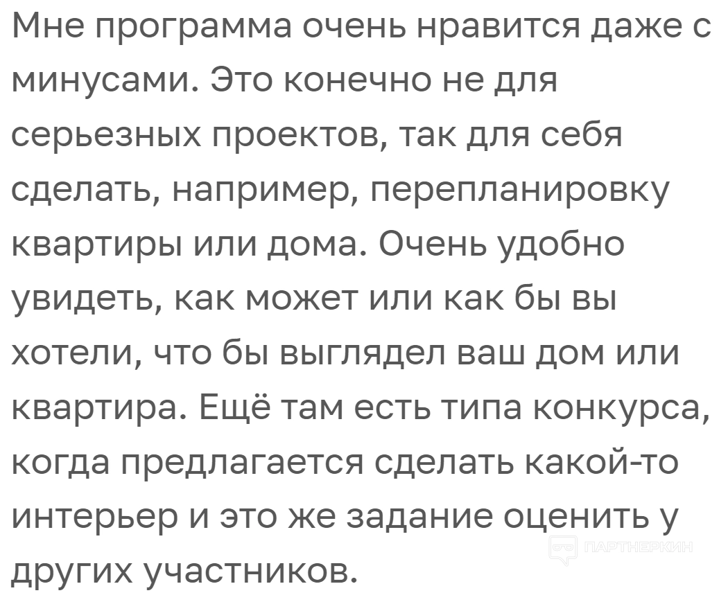 Другие пользователи пишут, что программа простая и не требует навыков в моделировании. При этом она позволяет разделять помещения, отображать комнаты в 3D, делать реалистичные снимки своих проектов и многое другое.