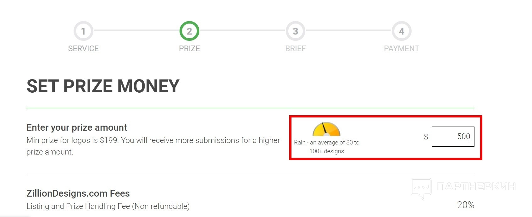 При заказе логотипа пользователь выставляет вручную минимальную и максимальную сумму приза. То есть, сколько он готов потратить на дополнительную работу.