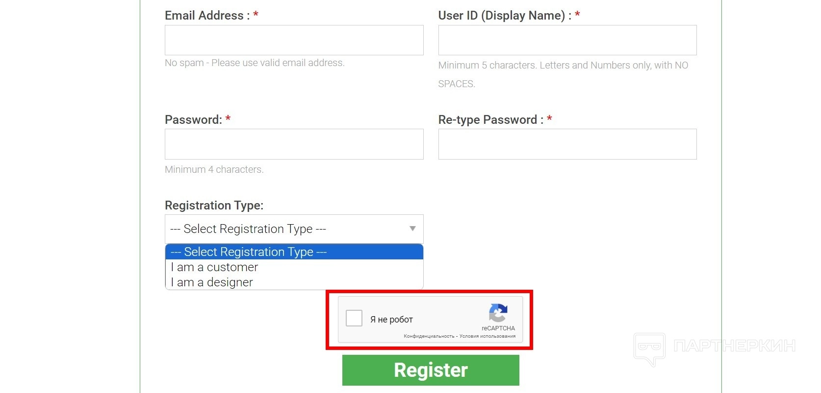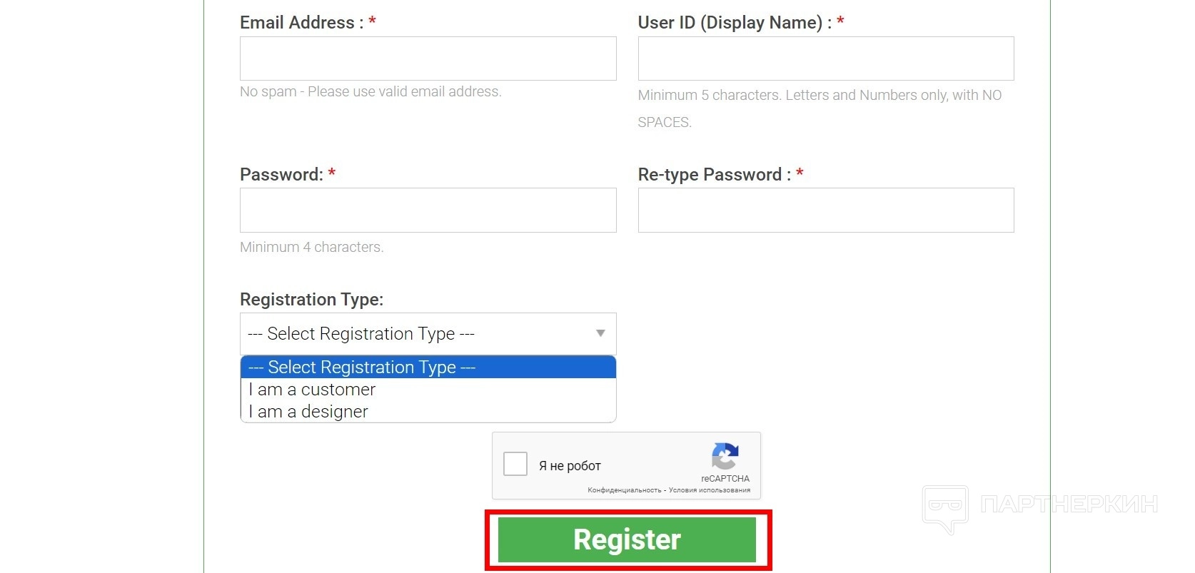 - Заполните регистрационную форму. Обязательно используйте поля, отмеченные звездочками. В разделе Registration Type можно указать свой вид деятельности: заказчик или дизайнер. Будет потом проще работать с платформой.