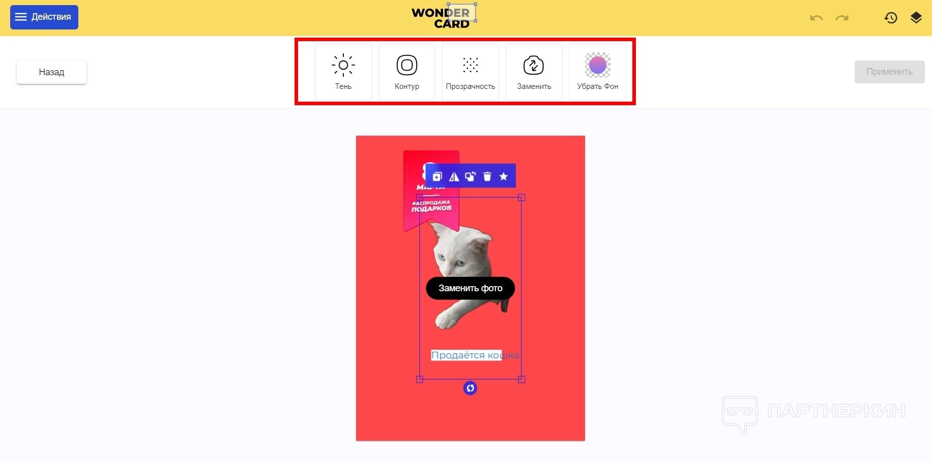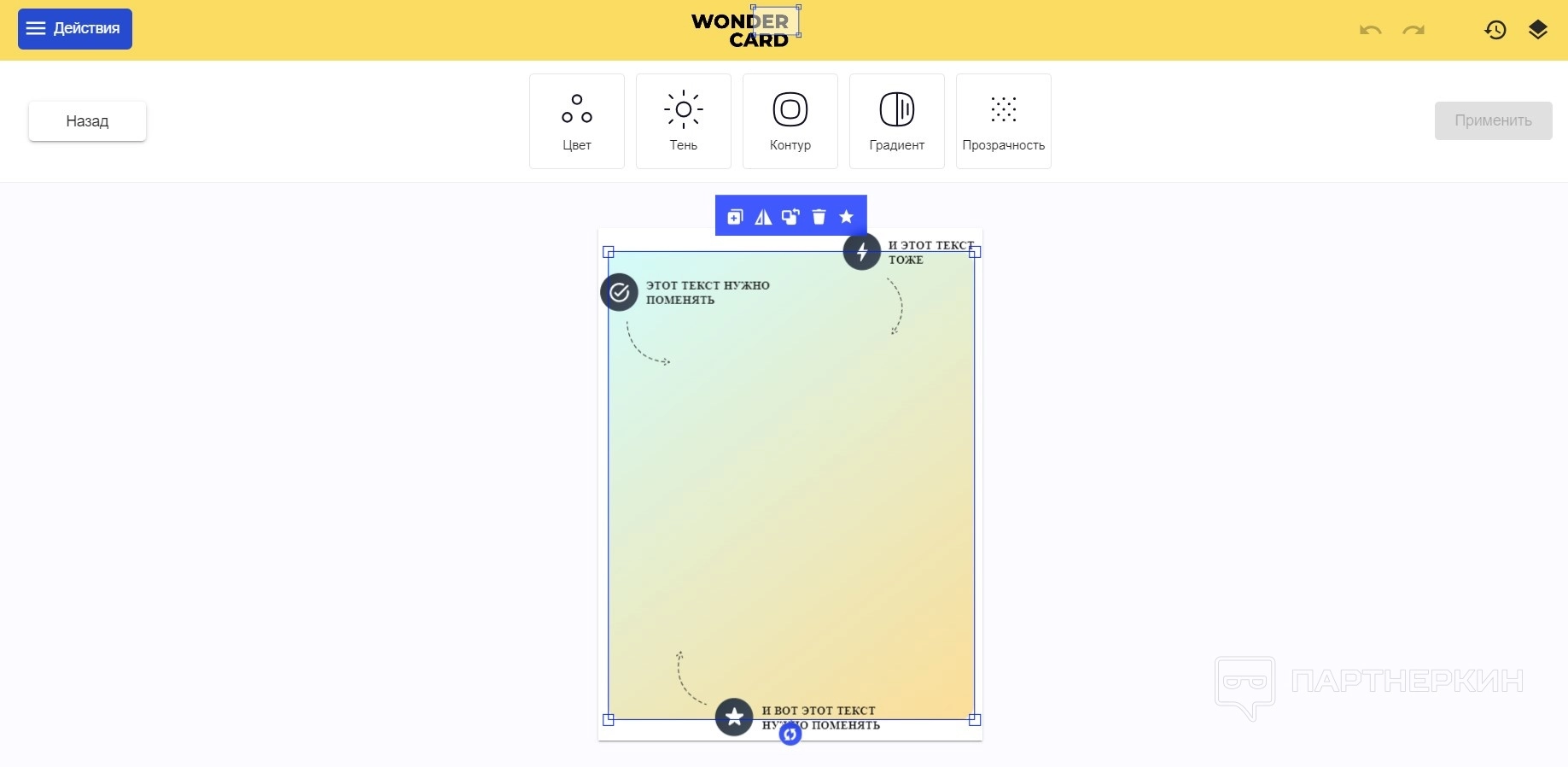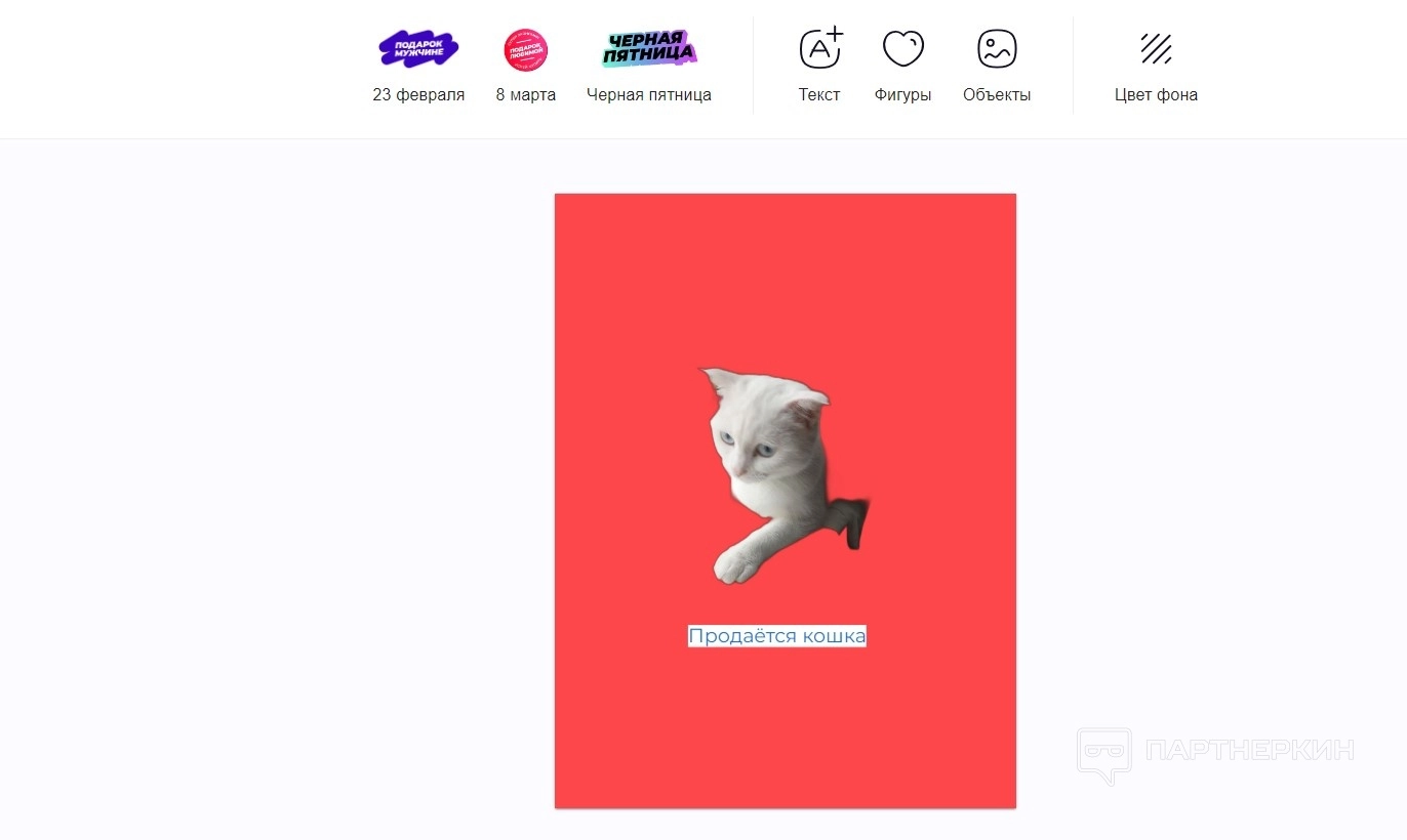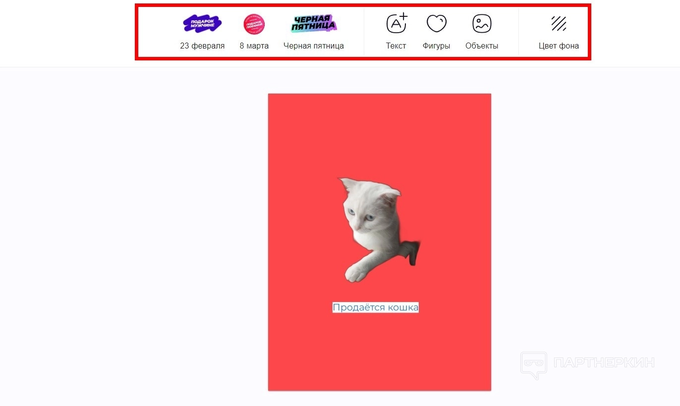 Конструктор выглядит следующим образом. В верхнем меню располагаются элементы для редактирования. Инструментов мало, но их хватает для простых и шаблонных операций. Можно добавлять текст, объекты, менять фон.