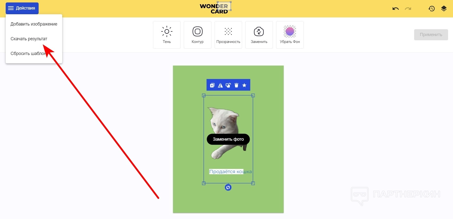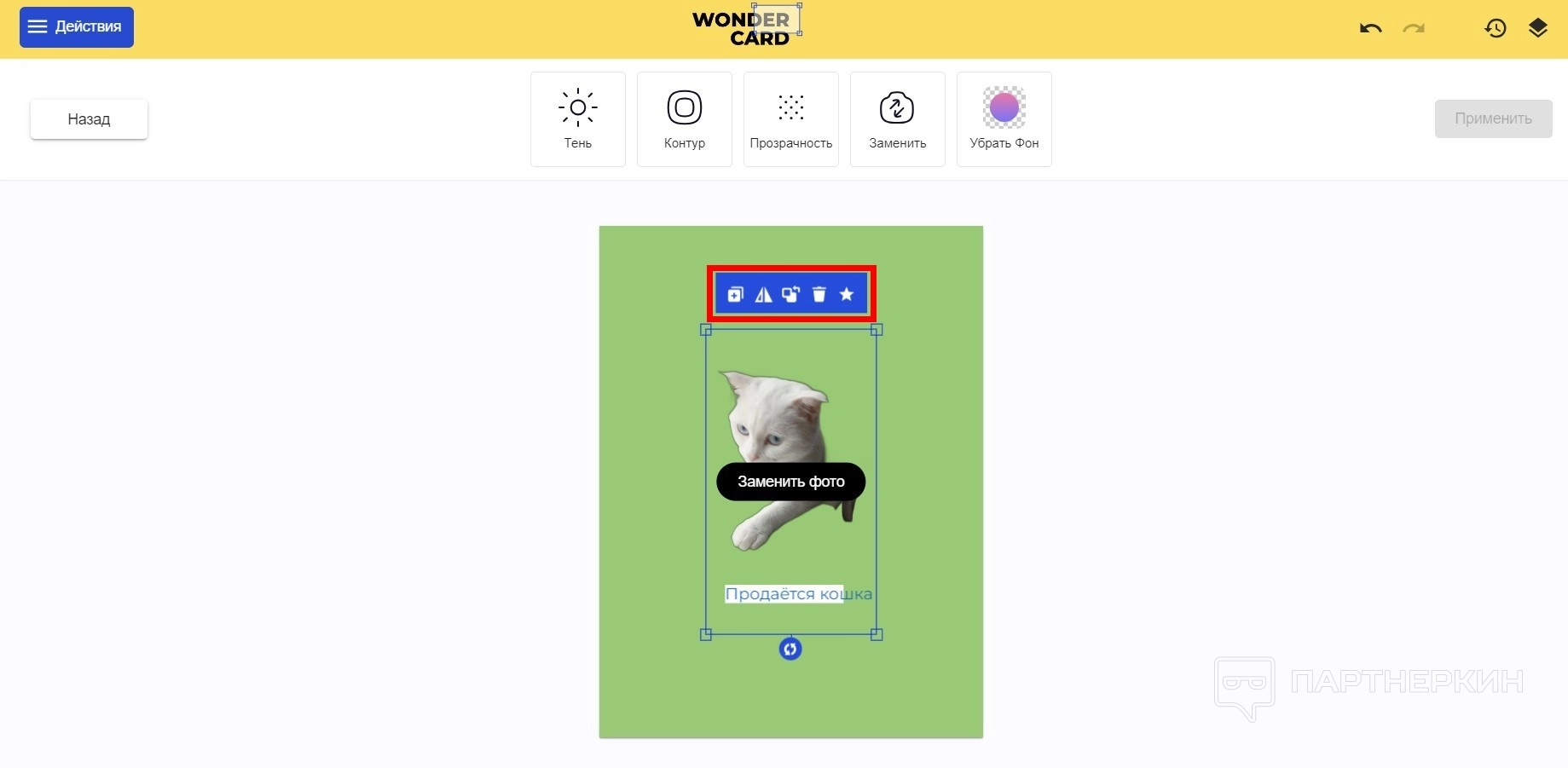 При выборе любого элемента на холсте, появляются дополнительное управление. Это свойства объекта. Они могут отличаться, в зависимости от типа. Например, при выборе изображения можно добавлять ей тень, контур, прозрачности и так далее.