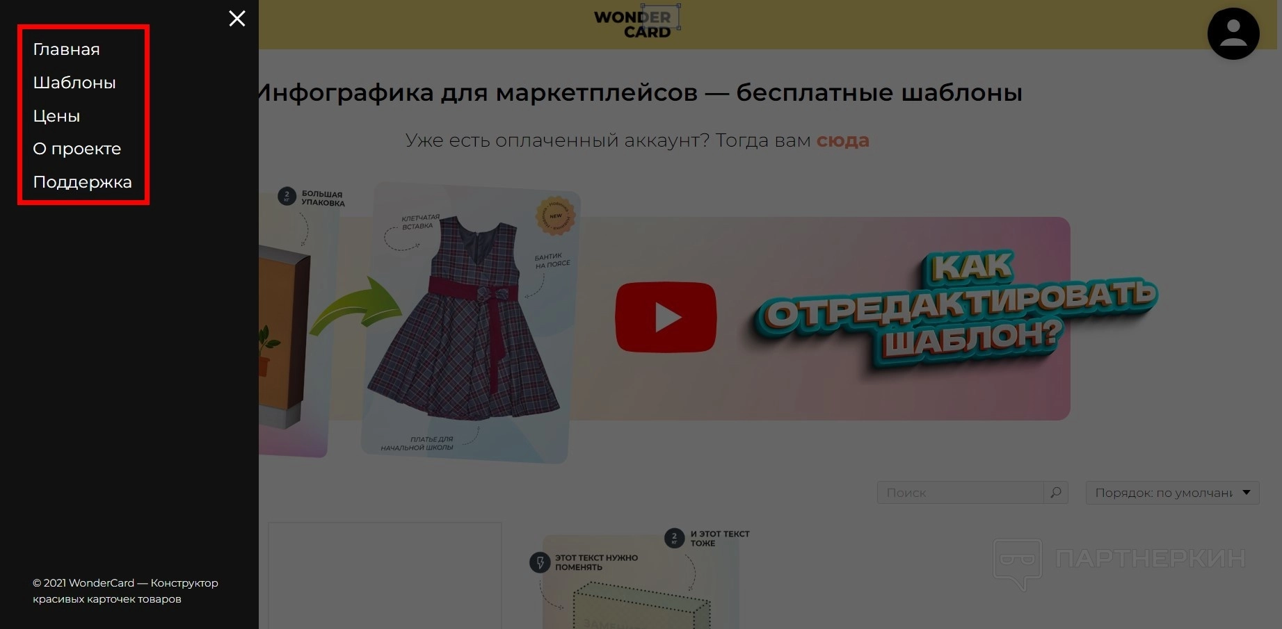 Личный кабинет состоит из нескольких блоков. Это настройки профиля, основное меню, конструктор и шаблоны для товарных карточек.