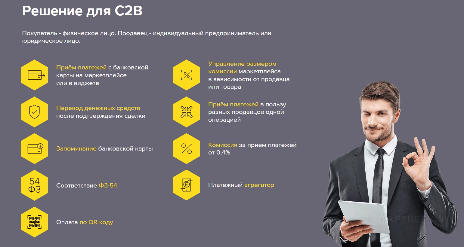Из удобств для торговых площадок: поддержка многоуровневой бухгалтерской системы, централизованное управление для компаний, интеграция платежного модуля в конструктор сайта. После подключения маркетплейсу будут доступны следующие возможности: