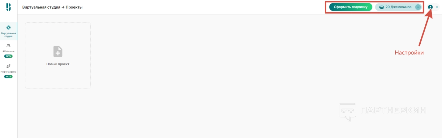 В правом верхнем углу вы найдете доступ к настройкам учетной записи. Там же вы можете оформить подписку или пополнить джемкоины, которые нужны для генерации фото.