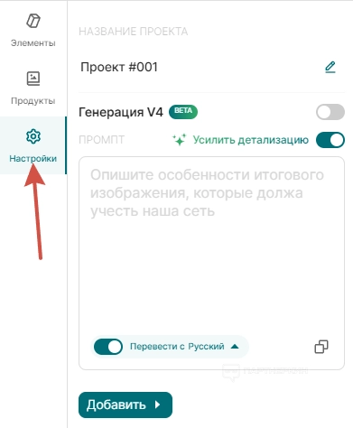 Последняя вкладка – «Настройки». Здесь вы можете задать название проекту, дать описание для ИИ-генерации, сохранить стиль, композицию и т.д.