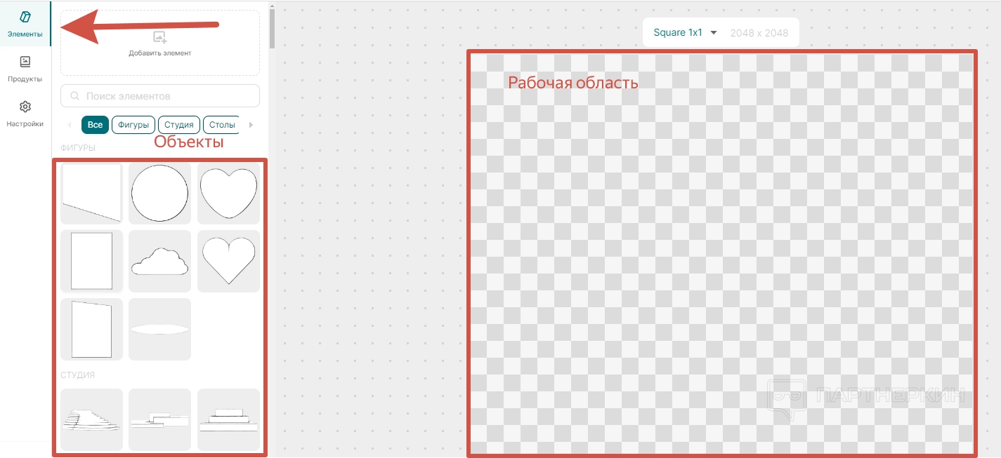 Когда вы выберите шаблон, откроется редактор. Первая вкладка – «Элементы». Там вы найдете все объекты, которые можно использовать для генерации фотографий: мебель, цветы, техника, декор и т.д. Достаточно выбрать элемент и просто перетащить его левой кнопкой мышки в рабочую область.