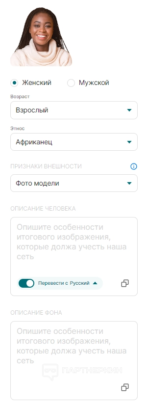 - Использование виртуальных моделей. Если требуется показать, как ваш товар выглядит на людях, можно создать виртуальные модели. С помощью искусственного интеллекта вы настраиваете внешность модели: возраст, пол, цвет кожи и волос — чтобы она лучше подходила под ваш продукт и аудиторию.