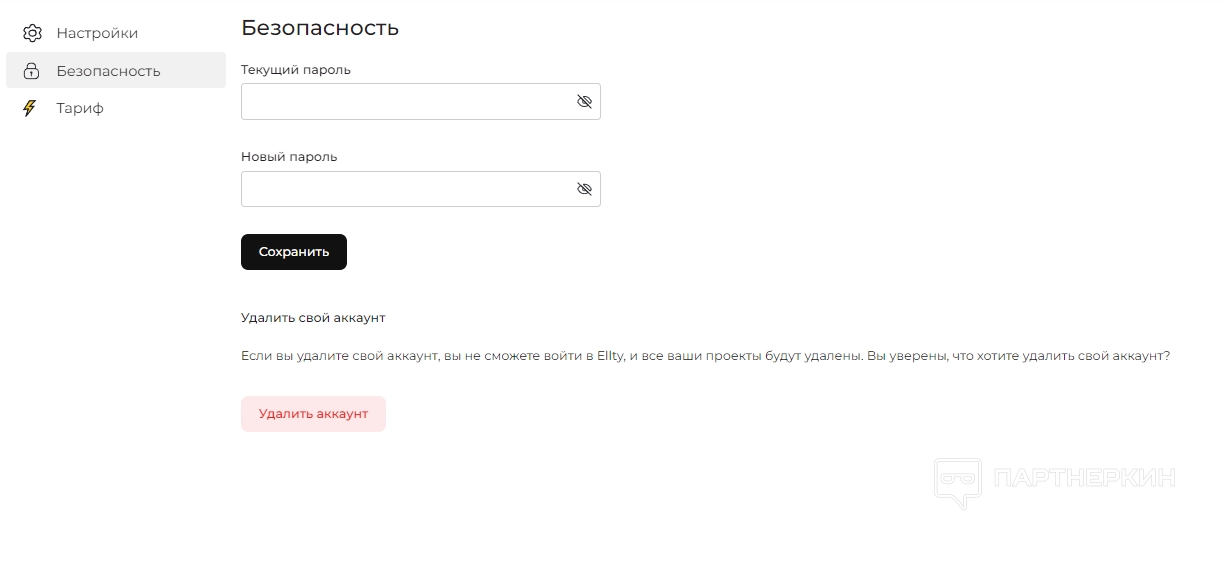 Во вкладке «Безопасность» можете придумать новый пароль и сохранить его, а также удалить свой аккаунт.