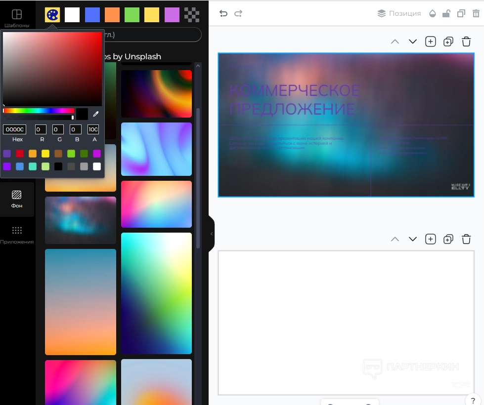 Фон . Можно добавить любой фон на слайд (нажмите на палитру цветов) или градиент с фотостока Unsplash.