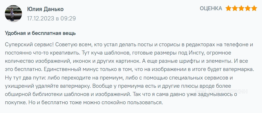 «Советую всем, кто устал делать посты и сторисы в редакторах на телефоне и постоянно что-то креативить» — отмечает Юлия. Девушке нравится, что в сервисе есть много шаблонов, готовые размеры под Instagram*, иконки, картинки, шрифты и элементы. Единственный минус — на изображении будет водяной знак.