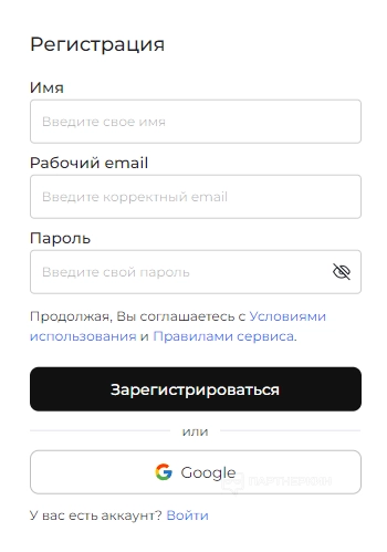 Откроется форма, где нужно ввести имя, адрес электронной почты или придумать пароль. Альтернативный способ — войти с помощью аккаунта Google.