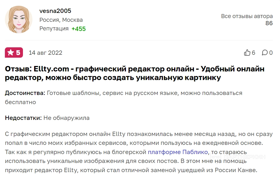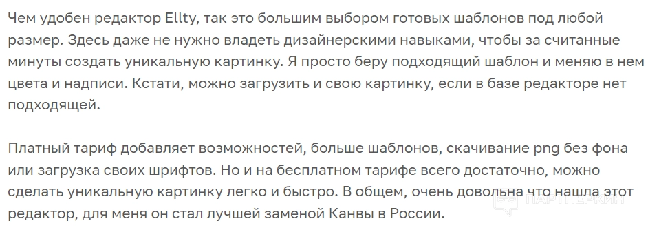 Девушка с ником vesna2005 отмечает большой выбор готовых шаблонов под любой размер. Даже не нужно владеть дизайнерскими навыками, чтобы за несколько минут создать уникальную картинку. «Для меня он стал лучшей заменой Канвы в России».