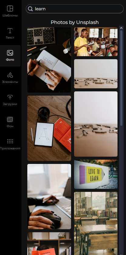 Фото . Можно добавить изображение на инфографику. Для этого в поле введите ключевое слово на английском языке. В сервис встроен бесплатный фотосток Unsplash, где вы найдете подходящие тематические картинки практически по любой теме.