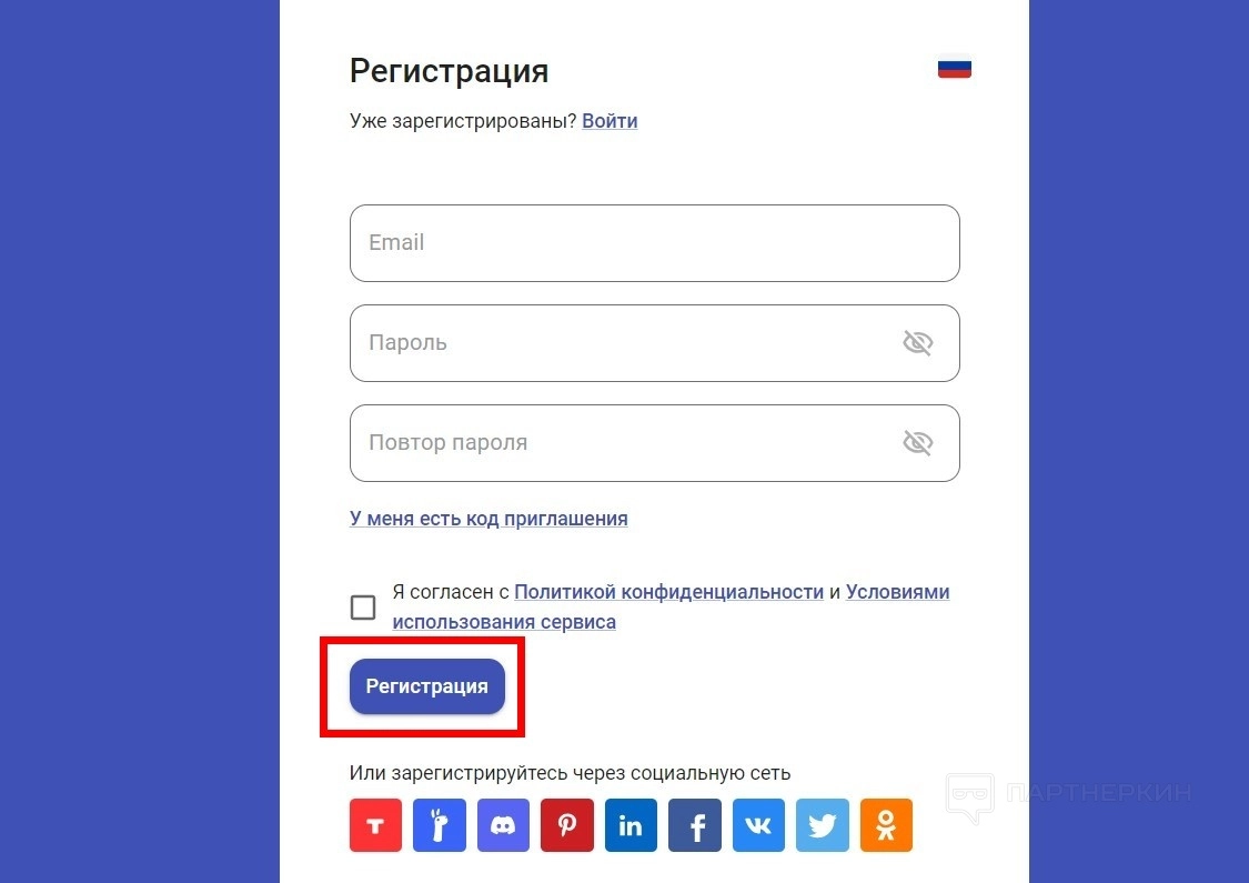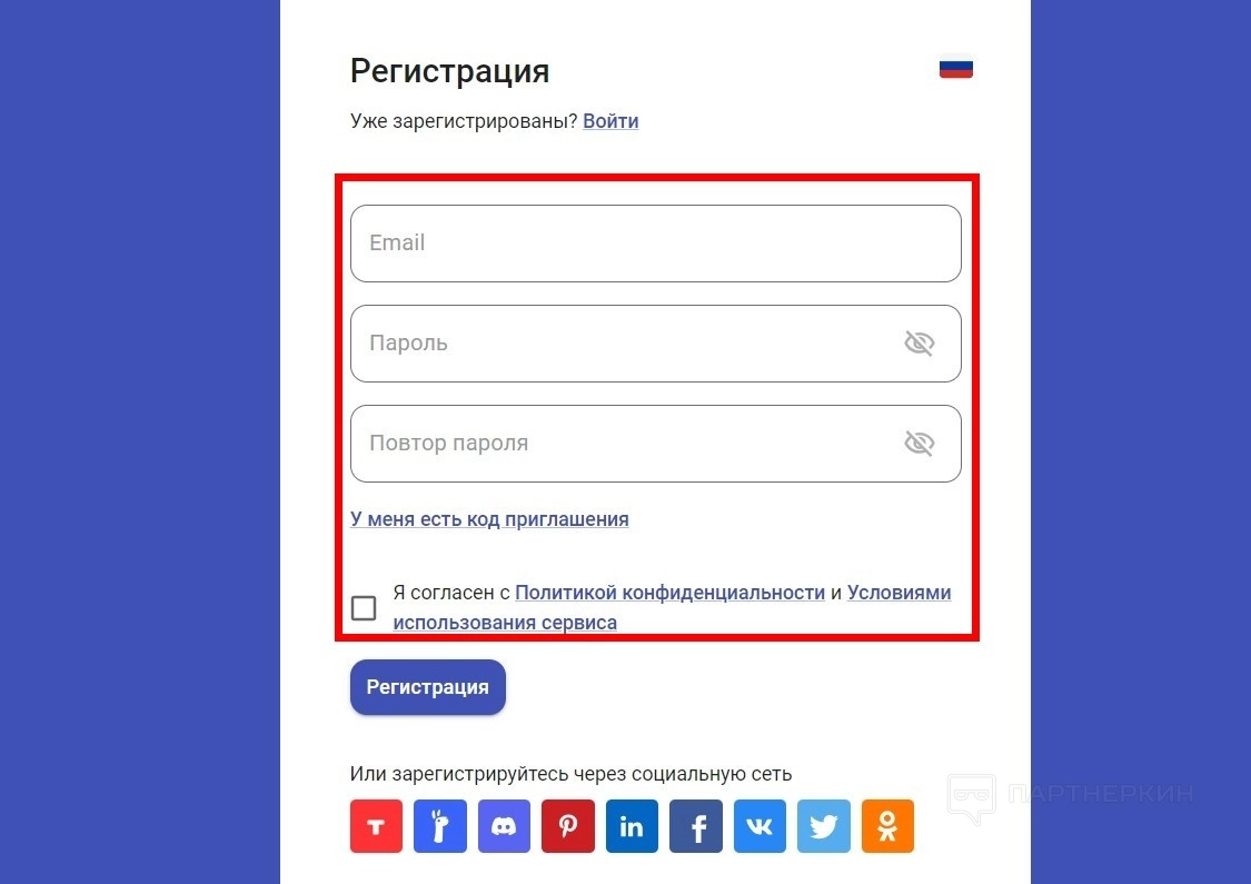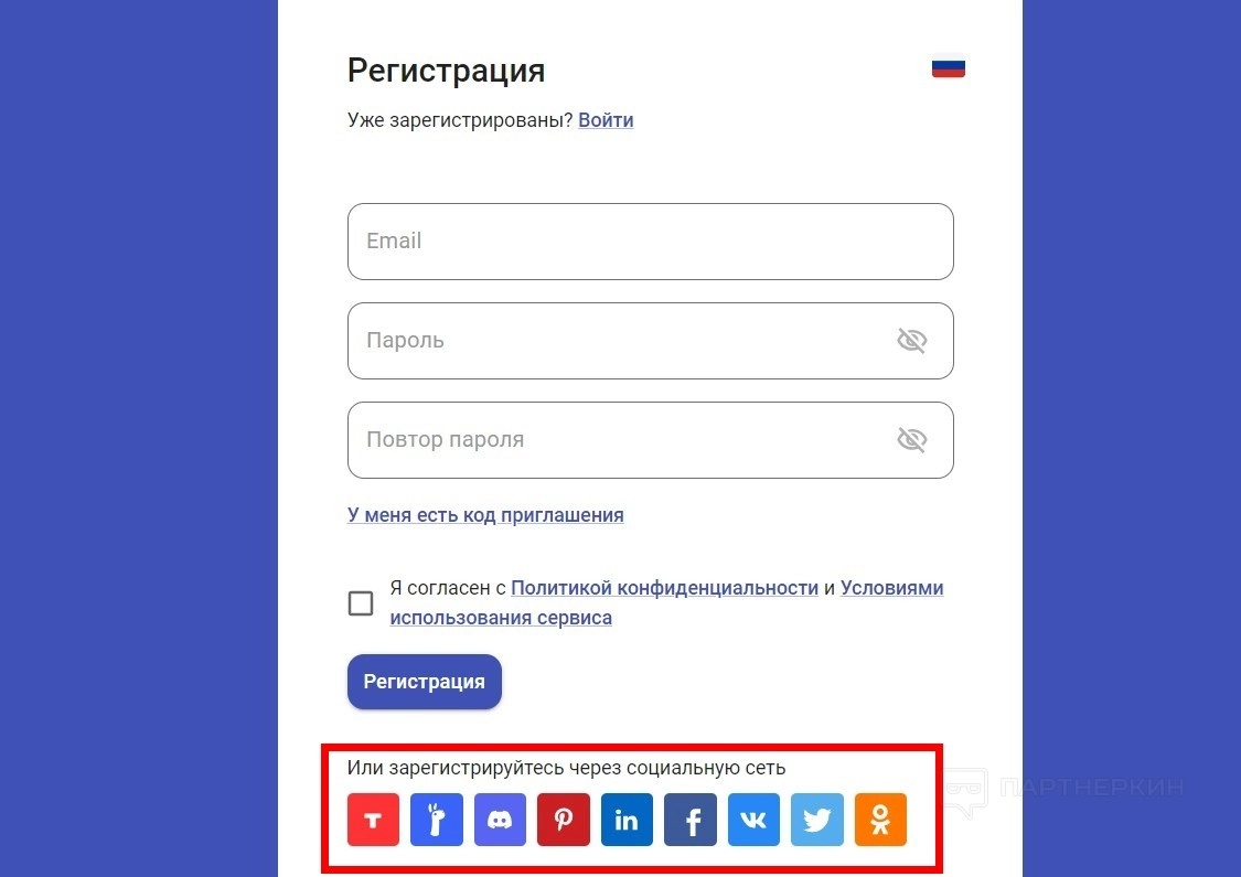 Также платформа предлагает использовать социальную сеть для регистрации аккаунта. Данный способ подходит, если у пользователя есть готовая учетная запись в стороннем сервисе. Достаточно дать согласие на обработку данных и заходить через эту социальную сеть. Только нужно подтвердить почту, которая привязана к этому аккаунту.