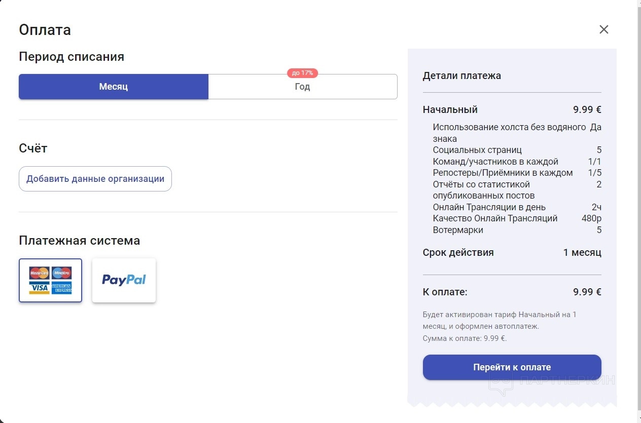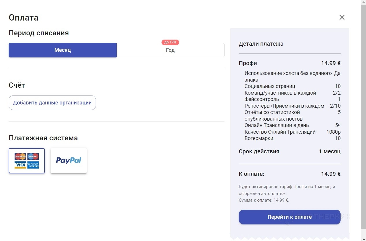 Оплачивать тарифные планы можно двумя способами: каждый месяц, ежегодно. При втором варианте можно сэкономить до 17%. Стоимость годовой подписки составляет €99,99 для «Начального» тарифного плана и €149,99 для «Профи».