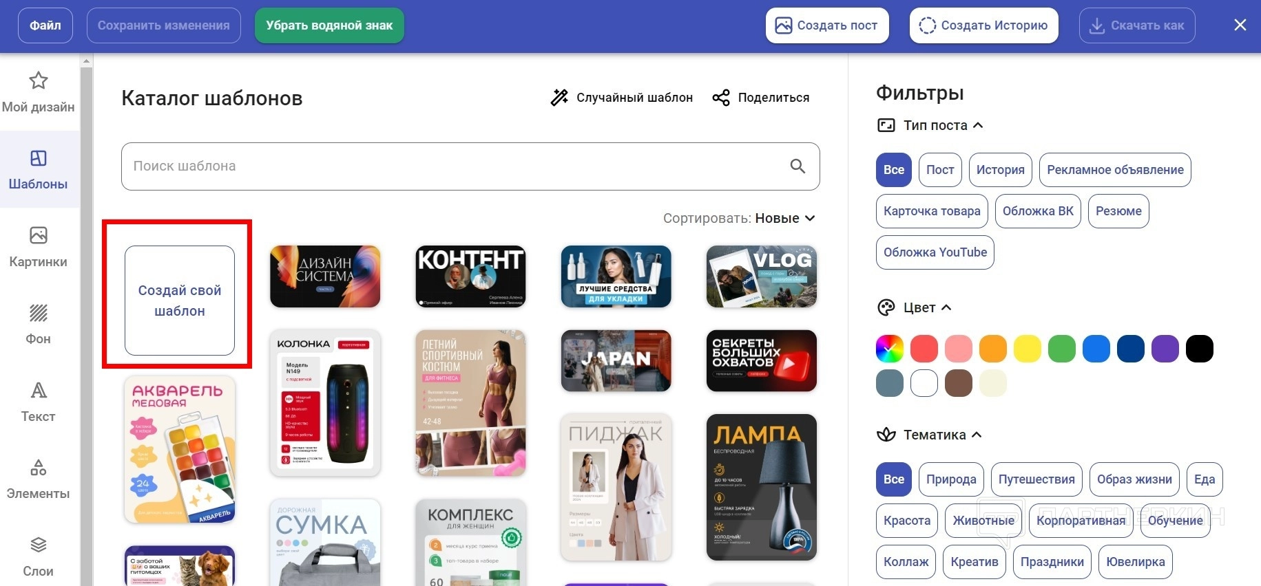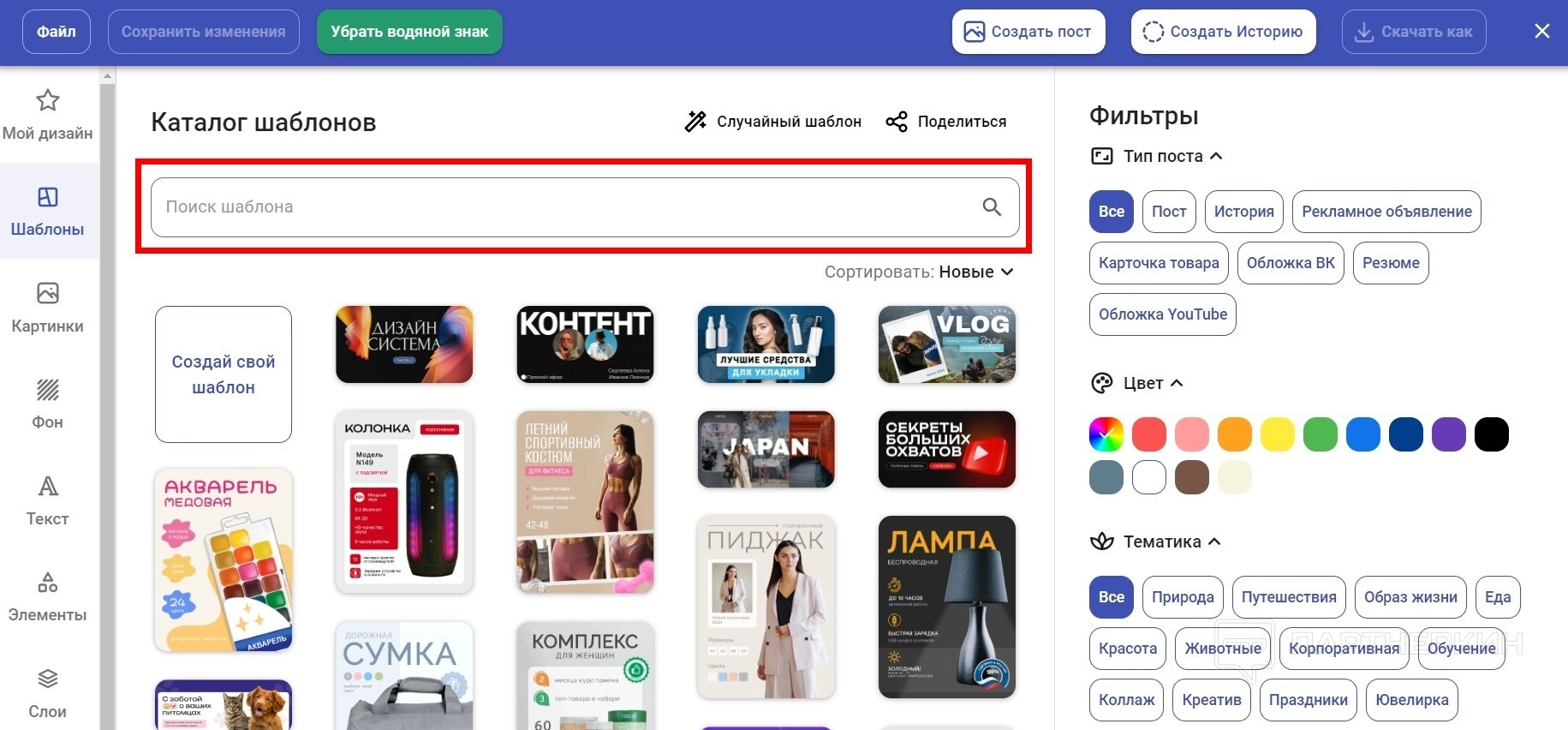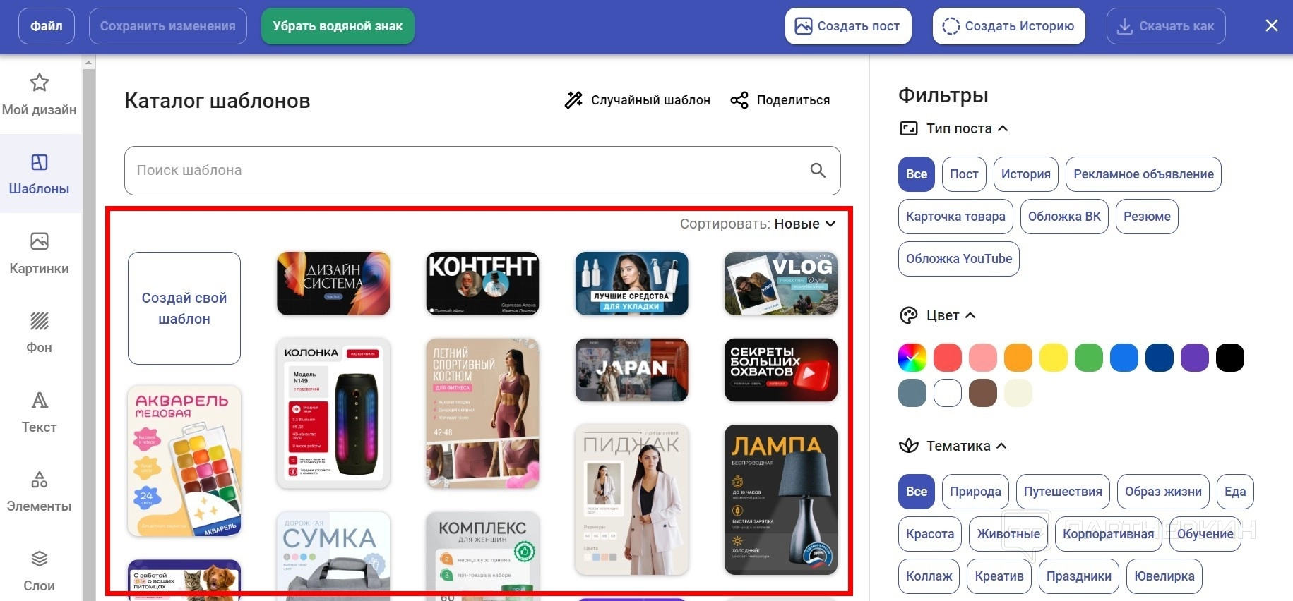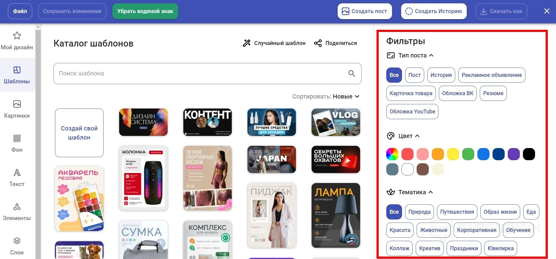 Сортировать шаблоны можно по нескольким критериям. Это категория (обложка, открытка, товар), тип поста (история, обложка ВК, карточка товара), цвет, тематика (путешествия, праздники, ювелирка).