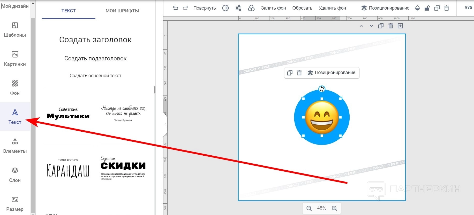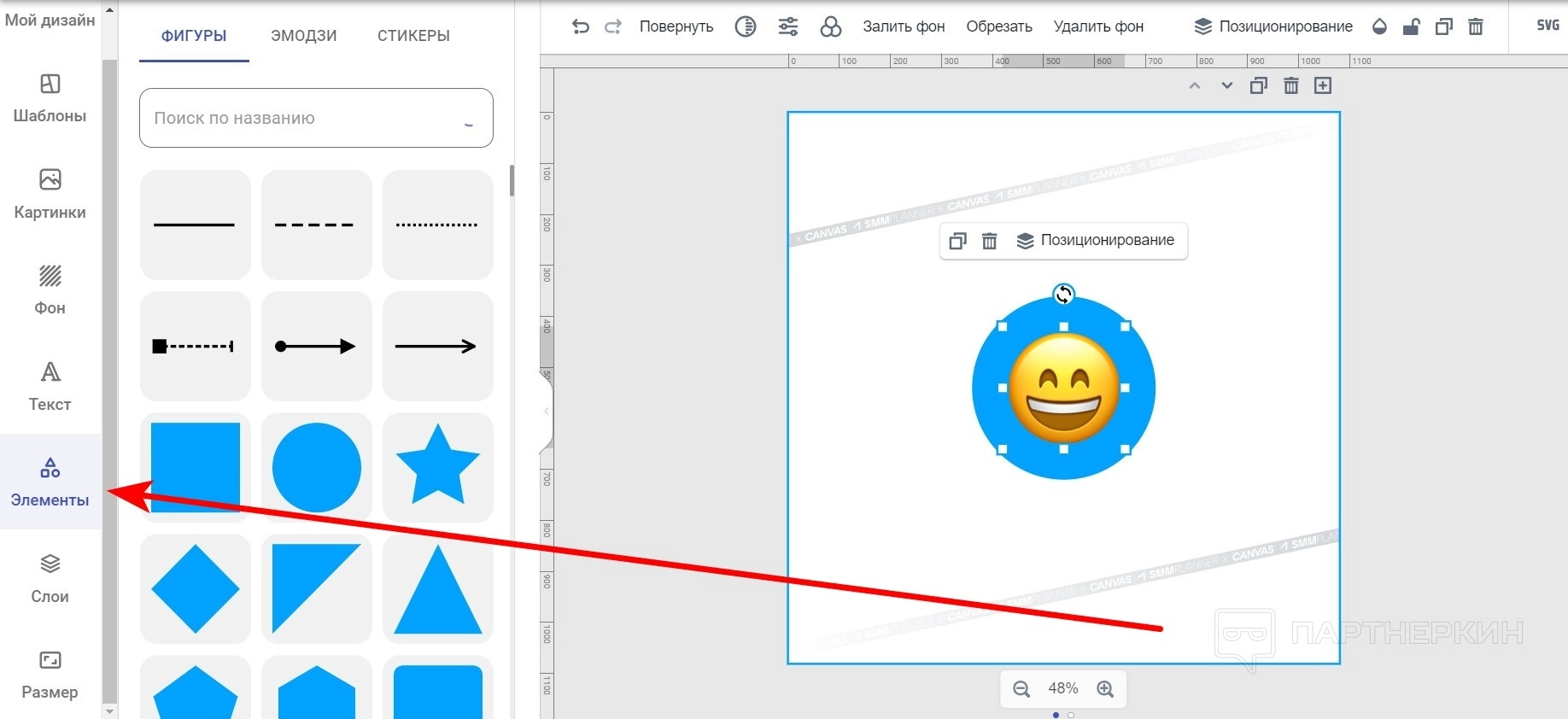 - Элементы. Геометрические фигуры, стрелки, границы, стикеры, эмодзи и другое.