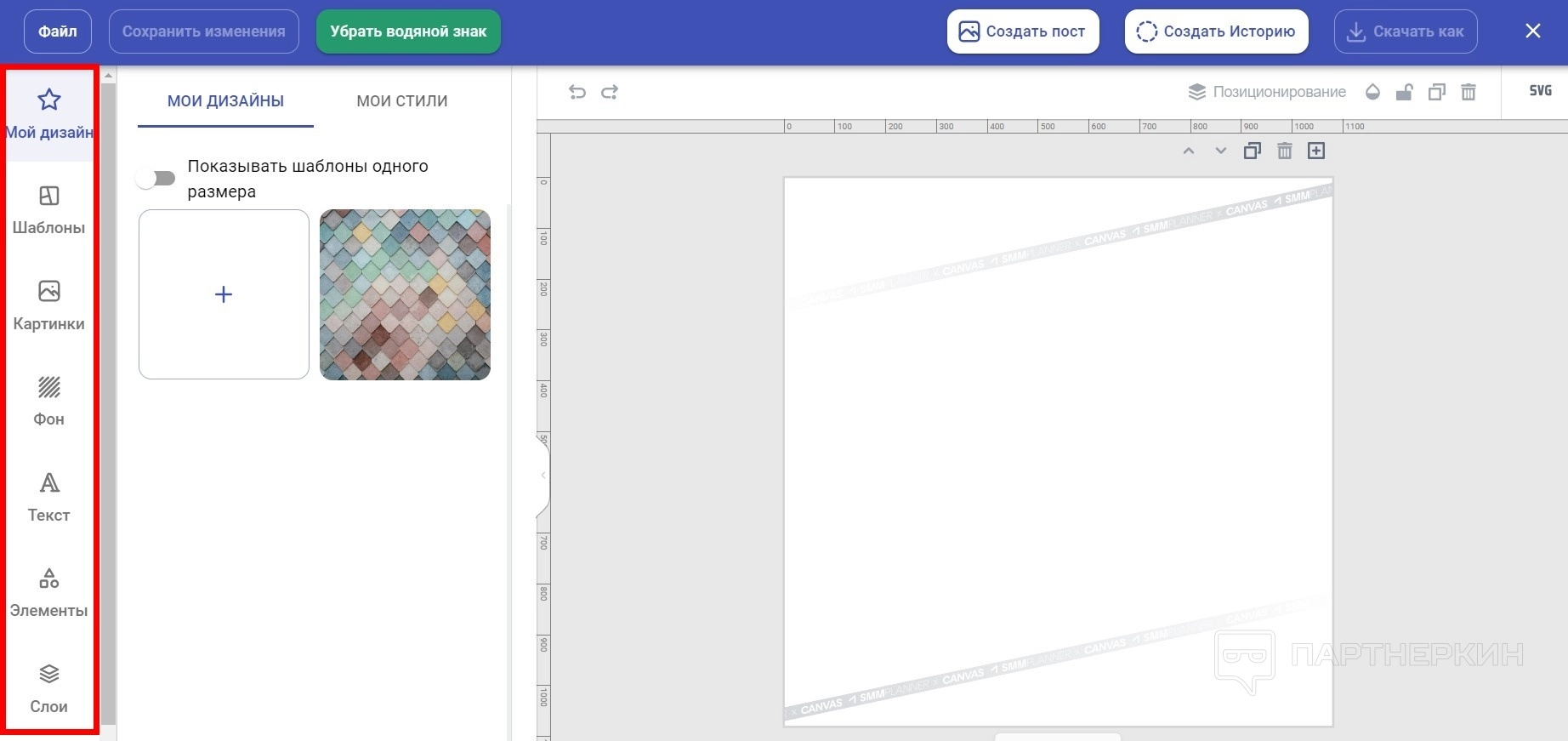 Боковое меню организовано инструментами сервиса. Оно предоставляет доступ к различным функциям для создания и редактирования контента. О нем поговорим позже.