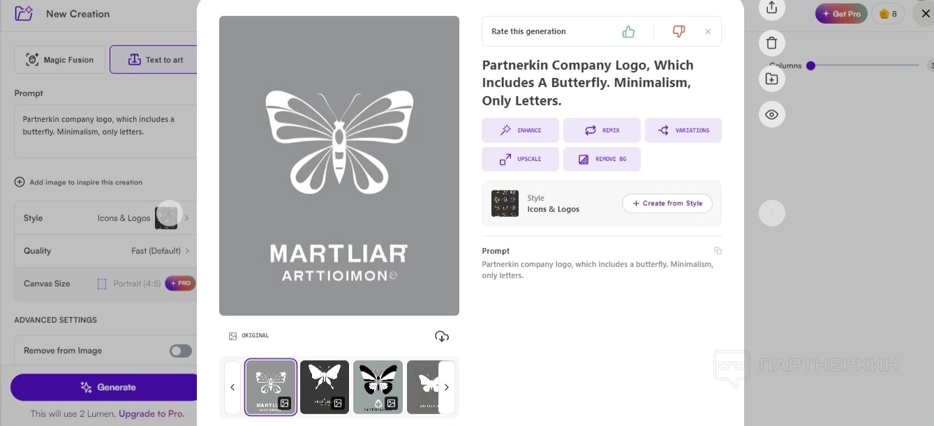 Первым делом нажимаем на кнопку Create и попадаем в рабочую панель генератора. В соответствующем поле Prompt вводим подробное описание своей задумки, а чуть ниже настраиваем предпочитаемый стиль и соотношение сторон изображения. Для более качественной генерации логотипа можно выбрать стиль Icons and Logos , однако это не обязательно.