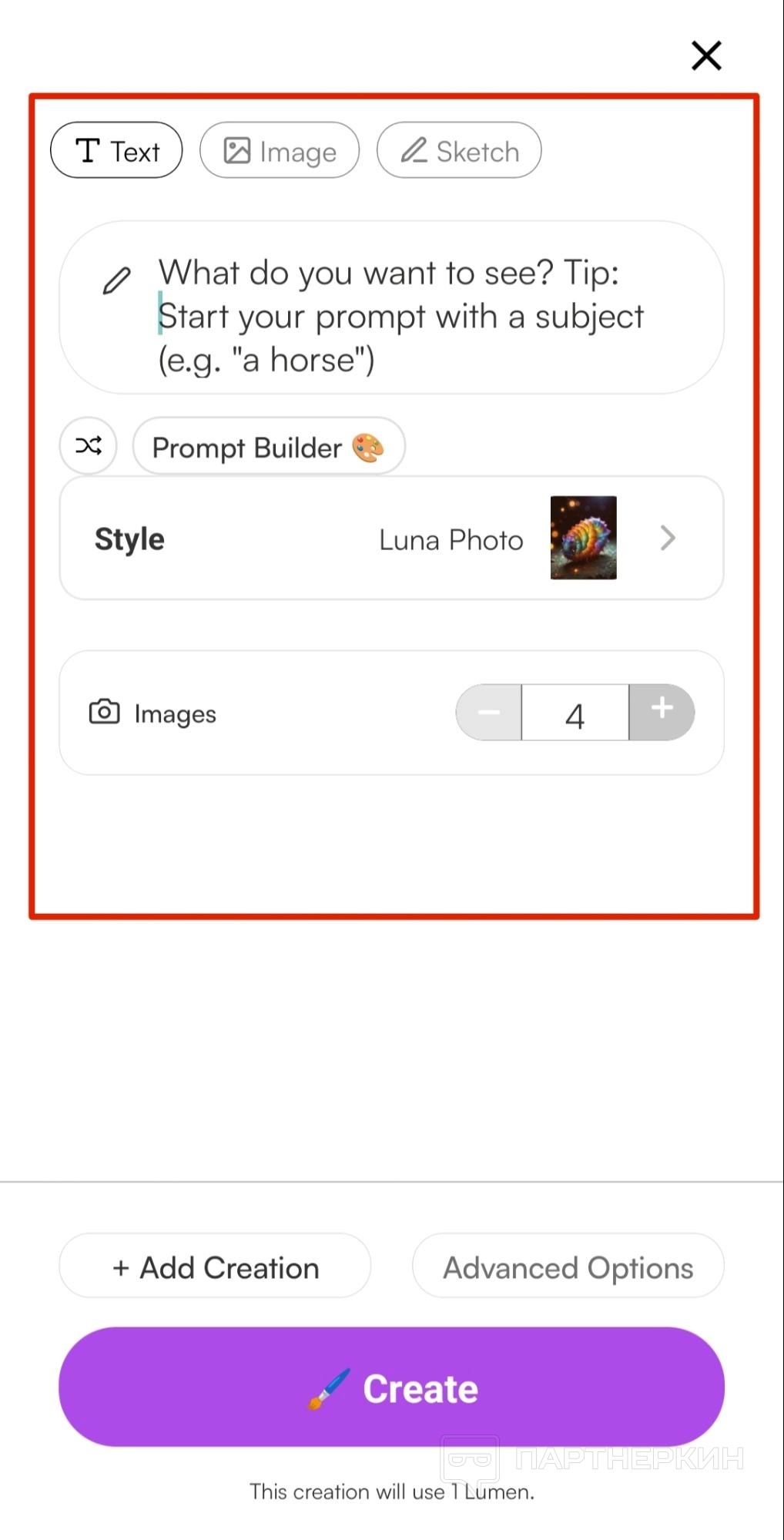 Далее происходит аналогичная веб-версии настройка ИИ: в текстовом поле вводится описание, а ниже можно выбрать необходимый стиль и количество сгенерированных за раз изображений. Запускаем генератор в работу кнопкой Create .