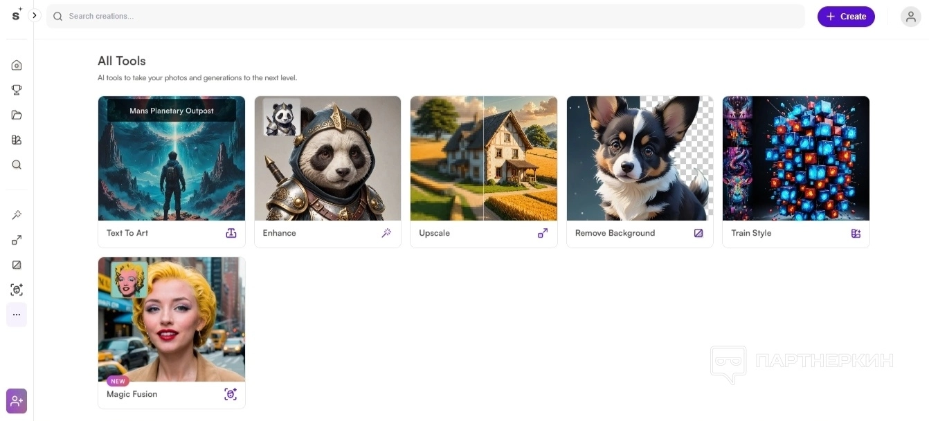- Train Style — создание новых стилей для работы с искусством и дизайном. Инструмент позволяет загружать собственные файлы и творения в качестве нового стиля, с которым в дальнейшем можно работать как самому, так и открыть доступ к нему для других пользователей платформы.