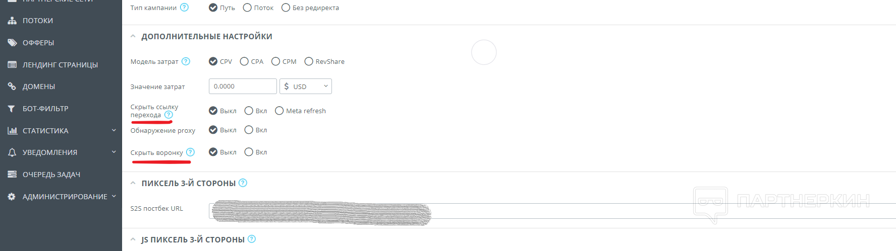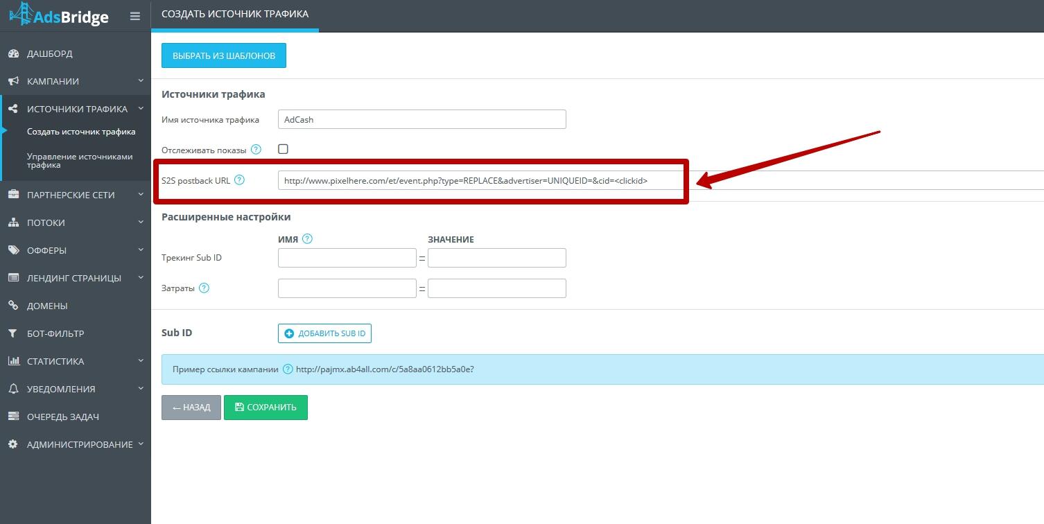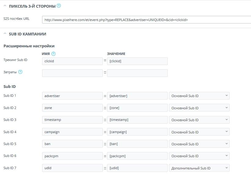 Внизу страницы настройка «S2S постбэка» и «Sub ID кампании», эти поля заполнены так как мы выбрали созданный ранее источник трафика.