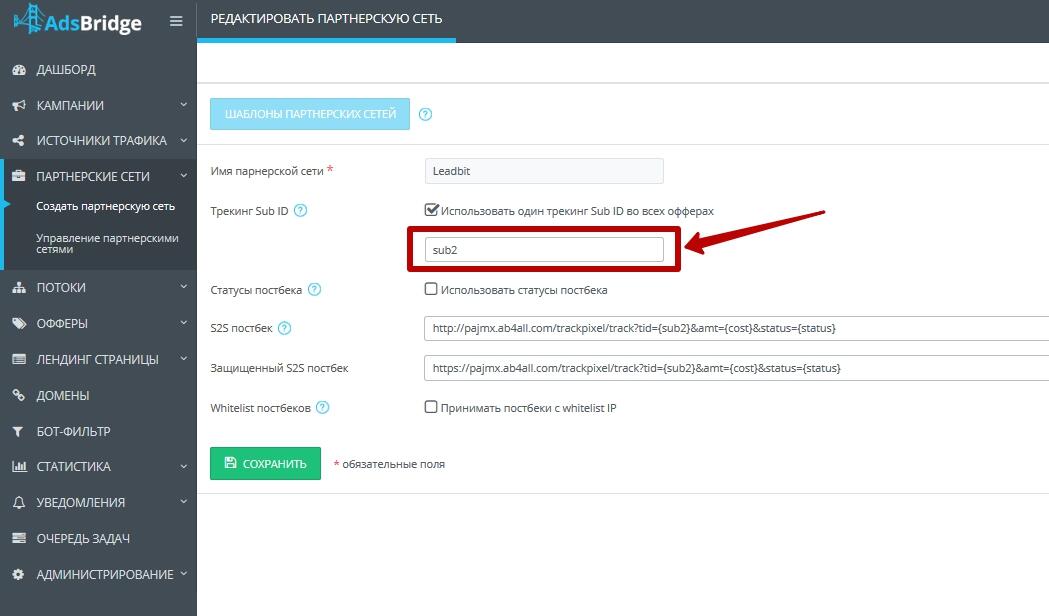 — Поле «Имя партнерской сети» заполняем Leadbit.