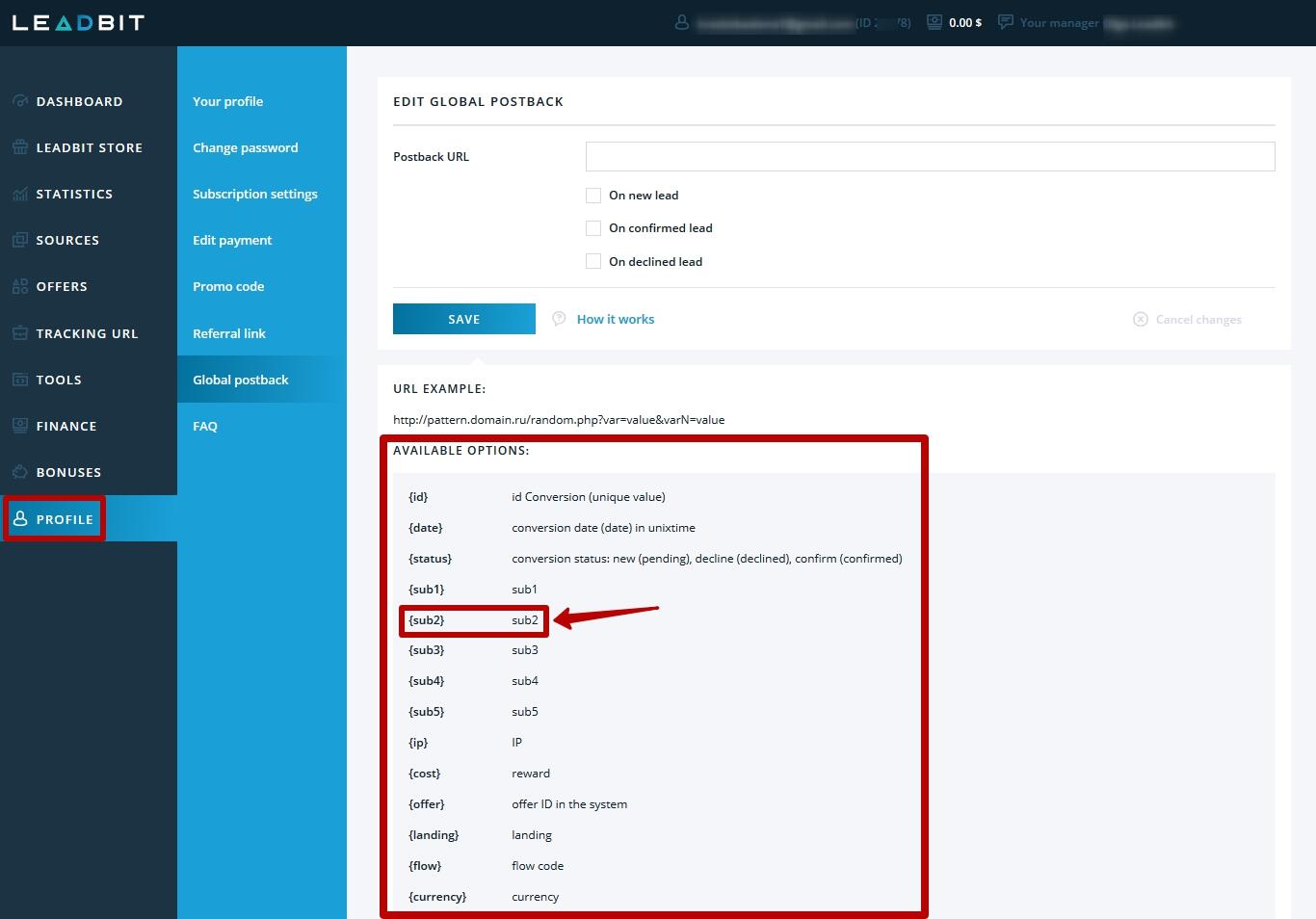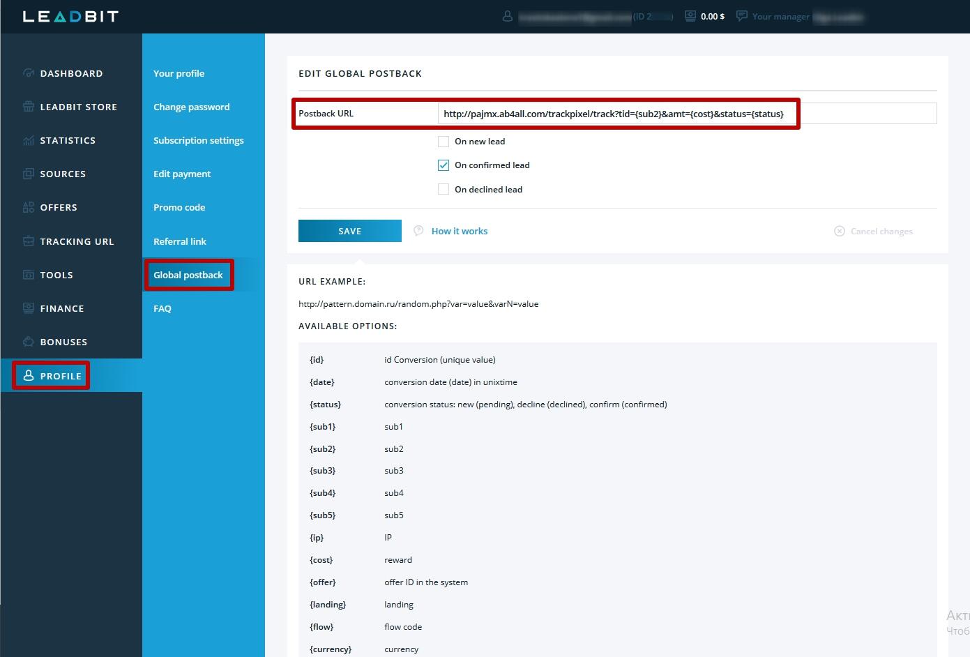 Теперь эту ссылку нужно вставить на стороне партнерской сети, для этого переходим в Leadbit — раздел «Profile» — Global postback: