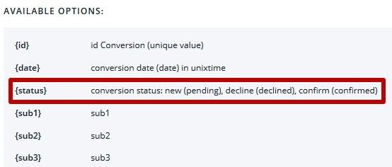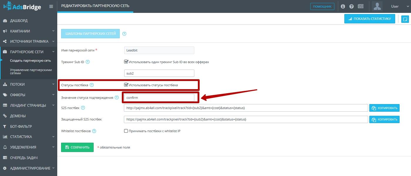 Отмечаем чекбокс «Статусы постбэка» и в ниже появившемся поле вводим «Статус подтверждения конверсии» — confirm: