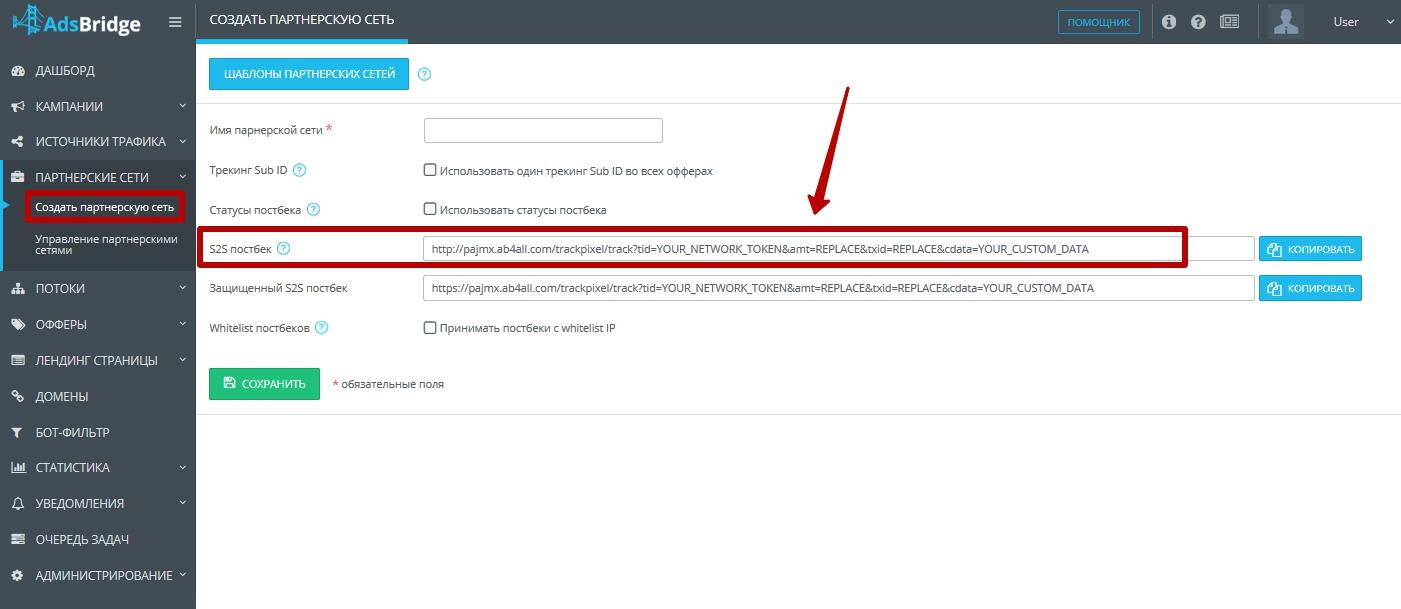 В AdsBridge копируем ссылку постбэка из графы S2S postback: