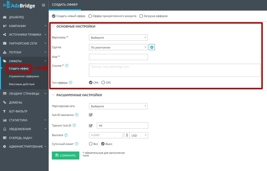 Переходим в раздел «Создать оффер». В основных настройках вводим данные об оффере, взятые на стороне партнерской сети: