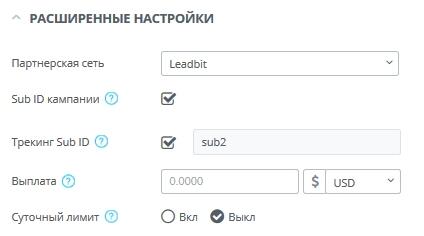 В расширенных настройках выбираем партнерскую сеть, которую мы создали ранее, поля «sub ID кампании» заполнятся автоматически вне зависимости от выбранной сетки и «трекинг sub ID» также заполняется автоматически: