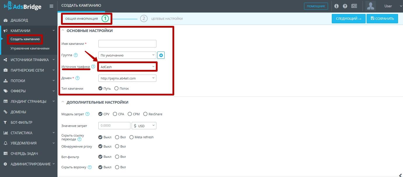 На этом настройка заканчивается, копируем ссылку кампании AdsBridge, ставим ее на источник трафика AdCash и начинаем лить на нее трафик.