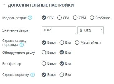 В дополнительных настройках необходимо выбрать модель и значение затрат: