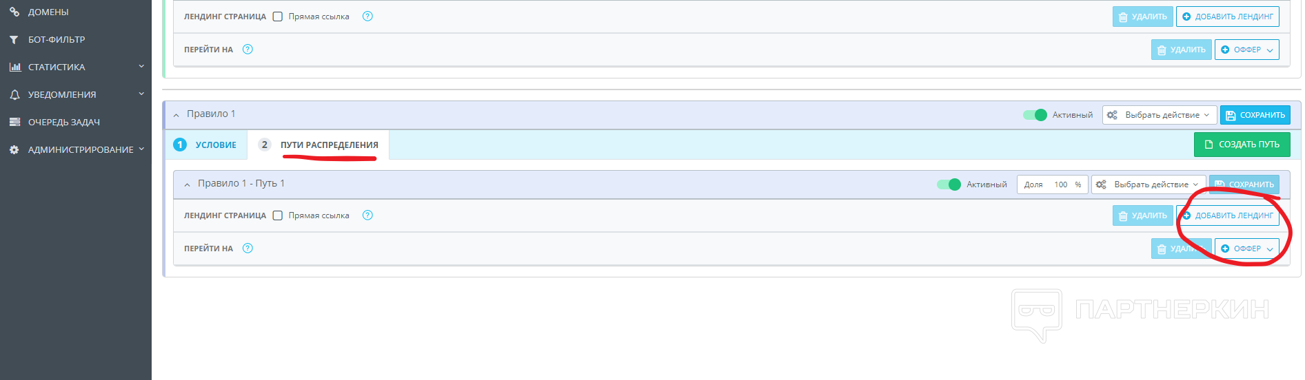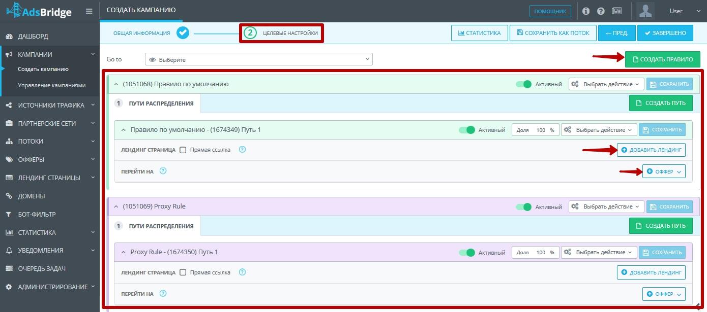 Далее, в «Правилах по умолчанию» в путях распределения выставляем нужные нам лендинг/офферы. Тех же самых модераторов отправляем на одну посадочную страницу (белую), а всех остальных пользователей на нужную нам.
