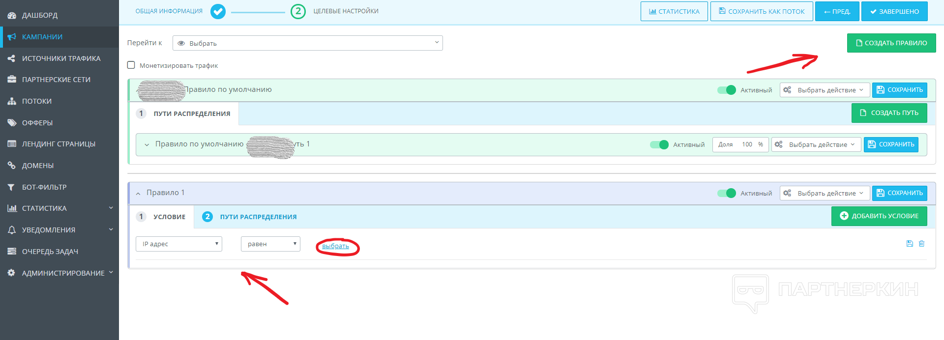 5. Далее заходим в свою кампанию в трекере, урл которого уже благополучно апрувнули в трафик-сорсе и создаем правило (как указано на скрине ниже), выбираем в разделе «Правило 1», «IP адрес», далее «равен» и вставляем скопированные нами ранее ip-адреса в табличку, нажимаем «Сохранить».