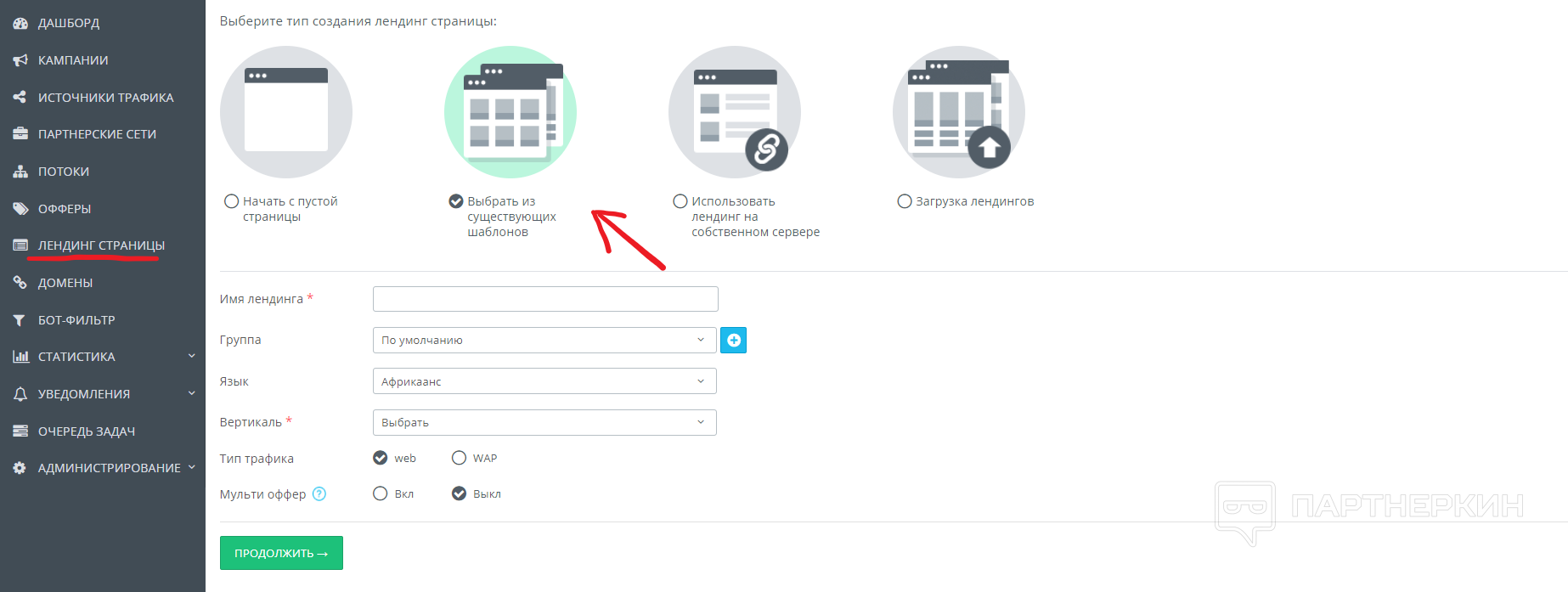 Переходим в раздел «Создать партнерскую сеть» в главном меню: