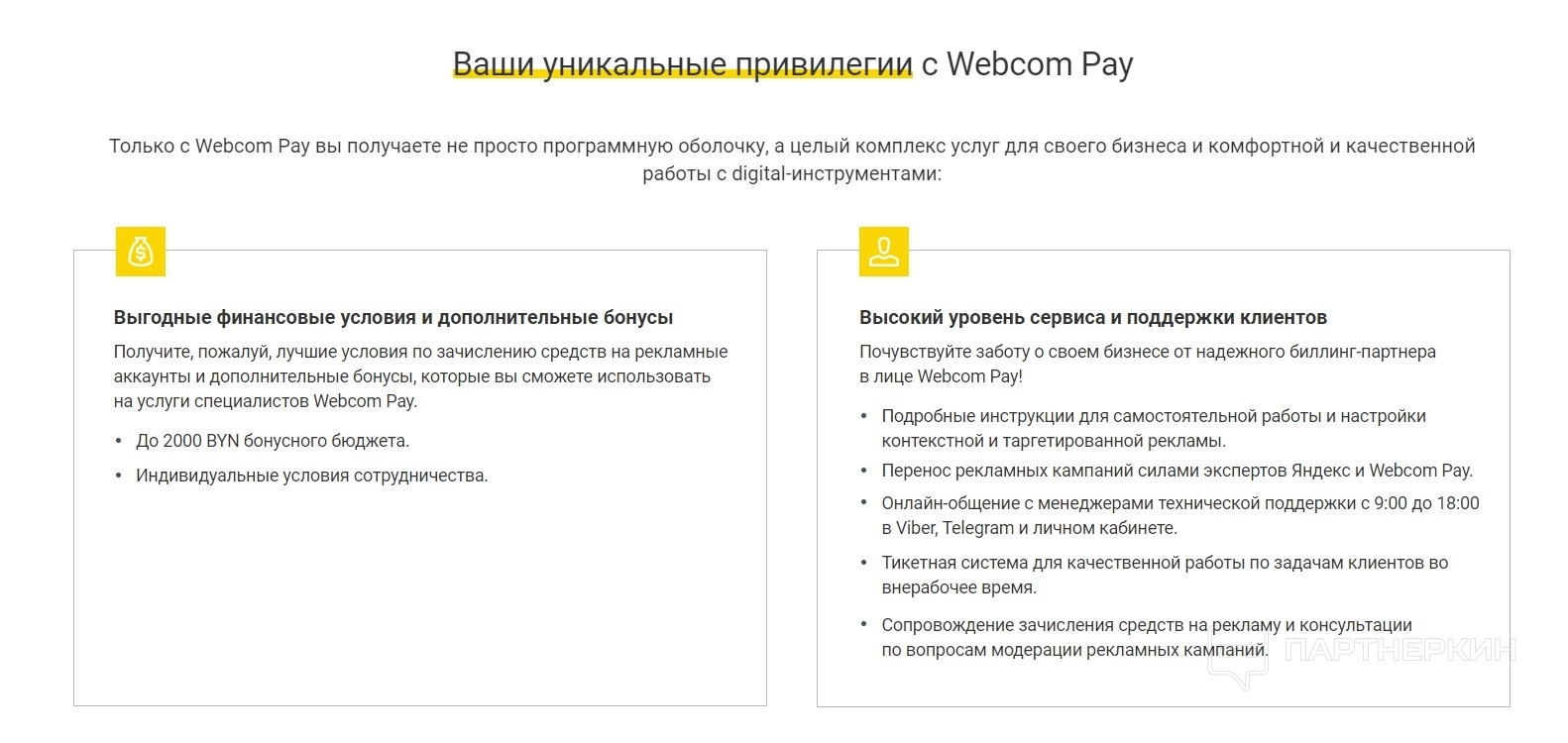 • Финансовые условия. Данная услуга выгодна обеим сторонам. Более чем на 2 000 BYN можно увеличить бонусы в своем бюджете. Дополнительно есть индивидуальные условия сотрудничества. Также способы получения средств на рекламные аккаунты.