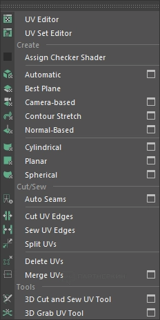 Меню «UV» предназначено для работы с UV-картами, которые используются для текстурирования объектов. В этом меню можно создавать и редактировать UV-карты, настраивать их свойства и параметры, а также применять различные преобразования и модификации для точного наложения текстур на поверхности моделей.