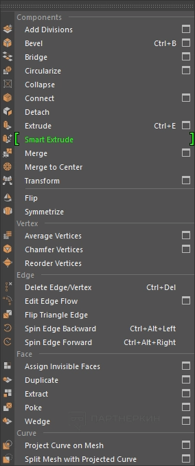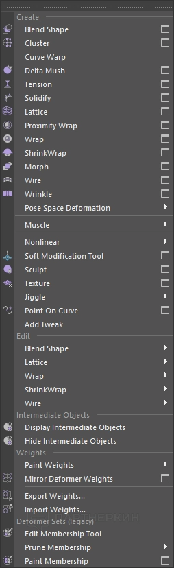 Меню «Deform» содержит инструменты для деформации объектов, включая изгиб, скручивание, растяжение и другие деформаторы. Эти инструменты позволяют изменять форму и структуру объектов, создавая сложные деформации и эффекты для моделирования и анимации.
