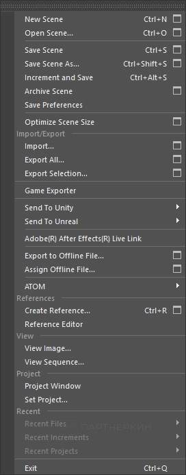 Меню «File» предоставляет функции для создания новых сцен, открытия существующих, сохранения и сохранения под новым именем. Оно также позволяет импортировать и экспортировать файлы различных форматов, что очень удобно для интеграции с другими программами и игровыми движками. В этом меню можно найти опции для настройки форматов файлов, что помогает обеспечить совместимость проектов с различными платформами и инструментами.