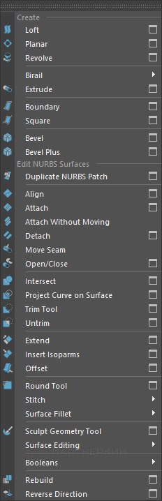 Меню «Surfaces» предназначено для работы с поверхностями, такими как NURBS и полигональные поверхности. Здесь можно создавать и редактировать поверхности, применять различные деформации и модификации, а также настраивать их свойства и параметры для создания сложных и детализированных моделей.