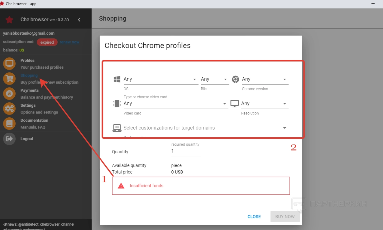 Вкладка «Shopping» — это магазин. Здесь можно найти продаваемые профили по цене от $1 до $30. При покупке учетки нужно указать некоторые данные, включая операционную систему, видеокарту, разрешение экрана, браузер и другое.